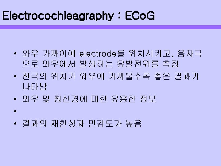 AEP의 종류 • Early response : 자극 후 10~15 ms 1. 전기와우반응(Eco. G) ; 1. 5~2 ms 2. 뇌간유발반응(ABR) : 5 ms 와우 ~ 뇌간 • Middle response : 자극 후 10~80 ms 중뇌 ~ 대뇌피질 1. AMLR(auditory middle latency response) 2. ASSR(auditory steady state response) • Late response : 자극 후 80~750 ms 1. ALR(auditory late response) 2. p-300(peak 300 msec) 3. MMN(mismatch negativity) 대뇌피질