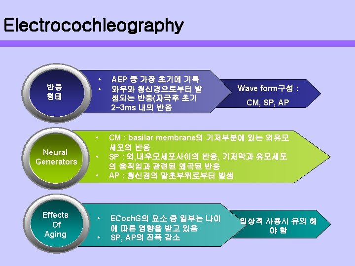 AEP의 종류와 나이에 따른 영향 AEP Parameter Age-related change ECo. G AP latency SP/AP ratio Q Q ABR Morphology Absolute latency Inter peak latency Amplitude Y Y N Y MLR Absolute latency Amplitude N Y ALR Absolute latency Amplitude Q Q P 300 Absolute latency Amplitude Y Y