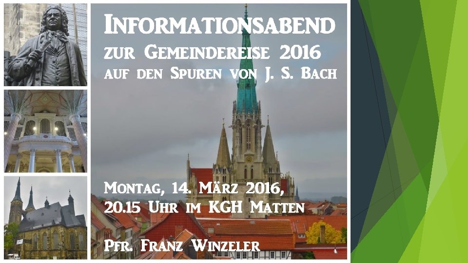 Auf den Spuren von J. S. Bach Gemeindereise im Überblick Stationen im Leben von J. S. Bach Übersicht auf Landkarten Besuchte Orte Allgemeine Infos Hinweis auf Vortrag Hinweis auf Gruppe 25+ Fragen Bilder zur Reise Buchempfehlungen zu J. S. Bach Gemütlicher Teil im Hotel Interlaken