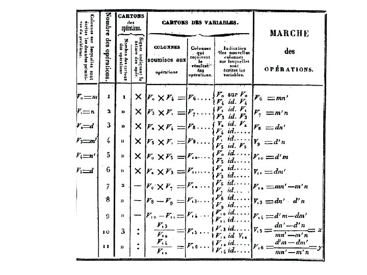 Des algorithmes Les diapositives suivantes présentent des tableaux d’organisation des calculs (résolution d’un système de deux équations linéaires à deux inconnues). Le second obtient le couple solution en utilisant seulement deux registres de plus que le premier qui ne fournit qu’une des deux projections du couple.