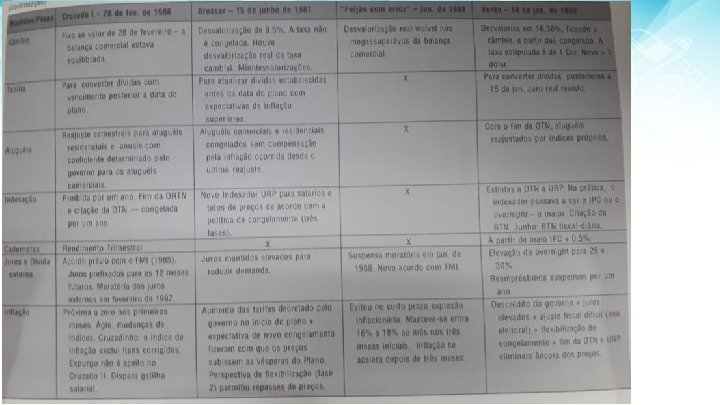 O Plano Cruzado • Desindexação da Economia: as ORTN foram extintas e substituídas pela OTN, cujos valores ficariam congelados por um ano. • Ficava proibida terminantemente a indexação de contratos com prazos inferiores a um ano. Todas as obrigações financeiras continuavam a ser denominadas na velha moeda, que era desvalorizada diariamente em relação ao cruzado, através da Tablita de conversão.