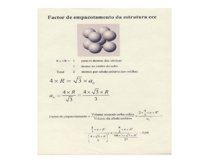 Fator de Empacotamento • FEA = Volume dos átomos em uma célula unitária, Vat = 4/3πr 3 Volume total da célula unitária, V C 4 r a a a 3