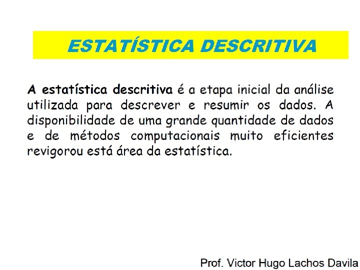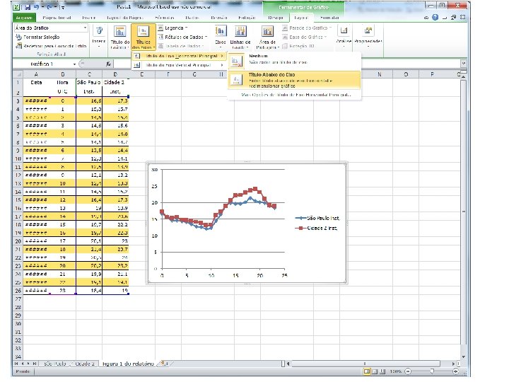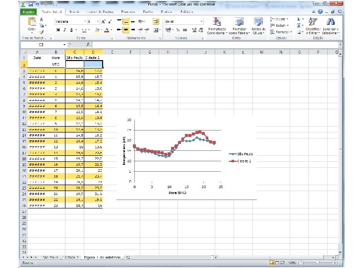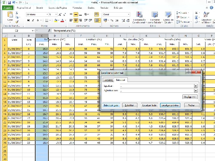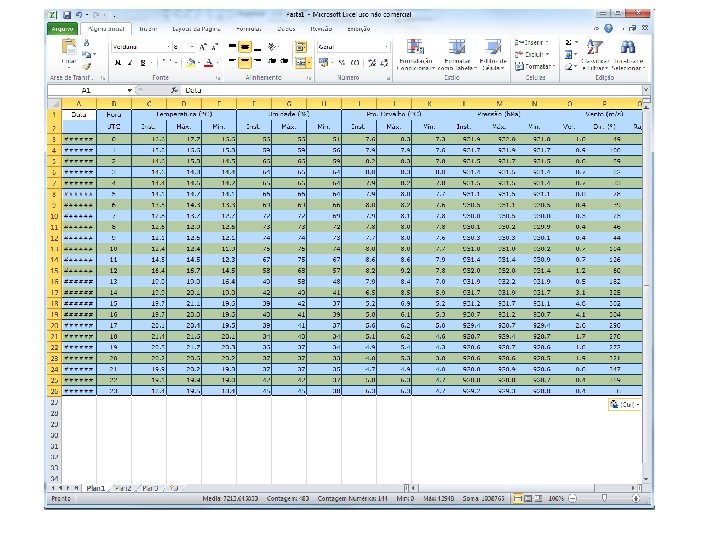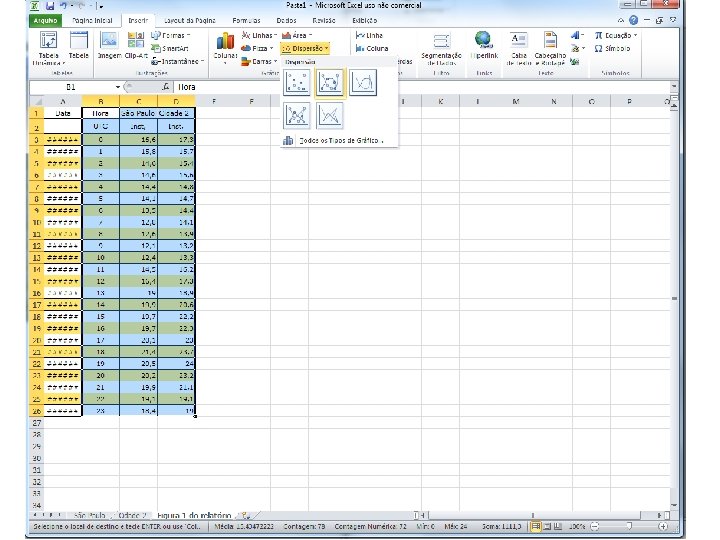 Refazer o exercício com outra cidade • Salve o arquivo excel (como aula 1_meunome tipo: pasta de trabalho do excel – coloque no desktop para ficar mais fácil de achar depois!) • Volte ao site do INMET (slide 3) • Escolha outra cidade • Atenção: selecione a mesma data (ontem) • Copie os dados numa outra planilha do arquivo excel e obtenha as medidas do resumo estatístico