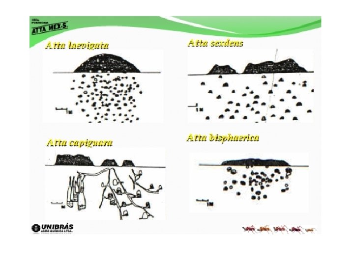 Cenário • MAIS DE 18 MIL ESPÉCIES – 2 MIL SÓ NO BRASIL • Estima-se que exista no mundo cerca de 18 mil espécies de formigas, mas aproximadamente 10 mil são conhecidas e catalogadas. No Brasil são 2 mil espécies, sendo 10 espécies denominadas saúvas do gênero Atta e 20 espécies do gênero Acromyrmex. • Existem cinco espécies mais importantes economicamente: saúva cabeça de vidro (Atta laevigata), saúva mata pasto (Atta bisphaerica), saúva parda (Atta capiguara), saúva limão (Atta sexdens) e saúva da mata (Atta cephalotes). • Além das saúvas do gênero Atta, há também algumas espécies de quenquéns que causam prejuízo para a agricultura: quenquém de cisco (Acromyrmex crassispinus), formiga de monte vermelha (Acromyrmex heyri), quenquém mineira preta (Acromyrmex lundi) e quenquém de monte preta (Acromyrmex lobicornis). • Essas espécies não causam tantos danos, pois seus formigueiros são de poucas panelas e não ultrapassam dois metros de profundidade. É meia dúzia de panelas e 175 mil formigas. Mas quando a infestação for grande, deve-se ter atenção.