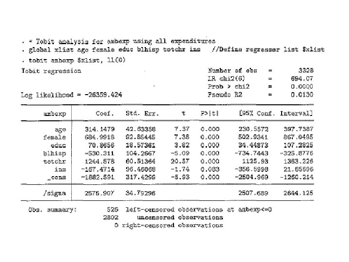 Modelo de regressão censurada • A variável y é censurada, somente observamos seus valores acima ou abaixo de um determinado limite. • Gastos iguais a zero, o dado é censurado à esquerda abaixo de um determinado limite L.