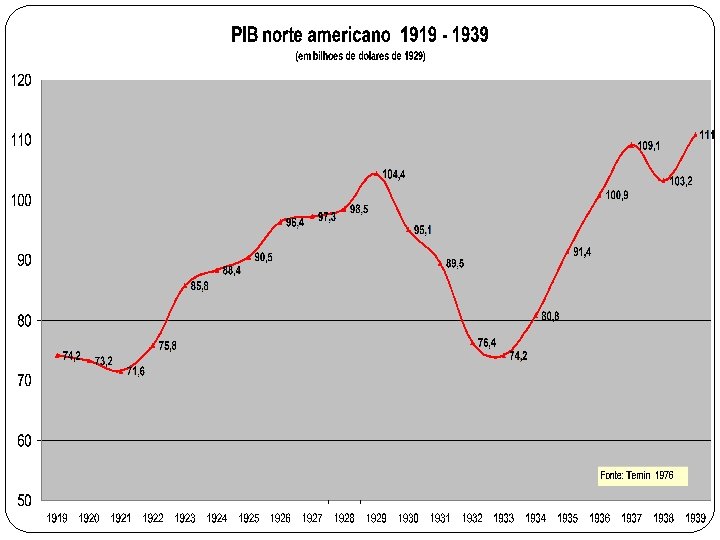 Crise de 30: Keynesianos x monetaristas Motivos e Política econômica Declínio “autônomo” da demanda agregada: (visão keynesiana) reversão do crescimento anterior investimentos (Robert Gordon) ou consumo (Peter Temin) Crise de sobre-investimento, superprodução, insuficiência de consumo Esgotamento das oportunidades de investimento e deslocamento da demanda por investimento (IS para esquerda-baixo) Dificuldades com a economia privada com algumas explicações estruturais: progresso técnico poupador de mão de obra, que reduziu a massa salarial que poderia sustentar o consumo Diminuição da geração de progressos técnicos (inovação de produto) redução da taxa de crescimento da população e redução da demanda agregada em geral e em particular no setor habitacional e na indústria automobilística; não incorporação de parte da população ao american way of life: Problemas com agricultura