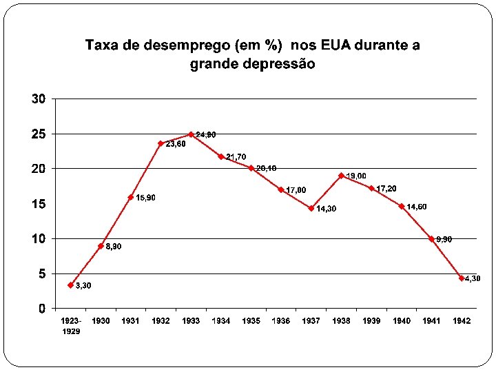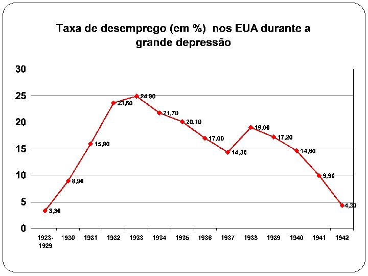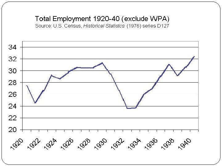Recuperação fases e características Formato de W – (bem) aproximado Recuperação: 1º semestre 33 (1º ND): “ os primeiros 100 dias de Roosevelt” Abranda: estagnação: até fim 34 Expansão até meados de 37 (2º ND) Recessão fim 37 e 38 Recuperação 39 (PIB alcança níveis de 29) Guerra – forte crescimento Recuperação – queda do desemprego, mas mínimo próximo a 10% (assistência) Com guerra desaparece Deflação no início, depois preços sobem lentamente