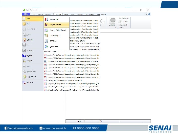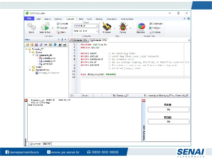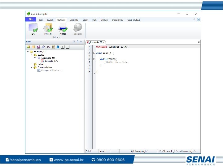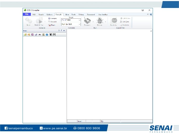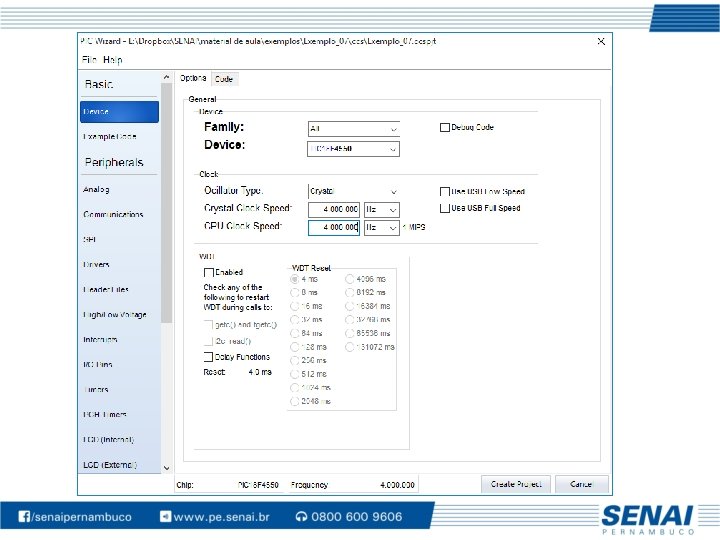 Criando um Projeto no CCS • Wizard para ajudar a preparar as configurações inicias. • Possibilidade de selecionar entre os microcontroladores compatíveis. • Várias possibilidades de configuração de A/D, Timers, clock etc.