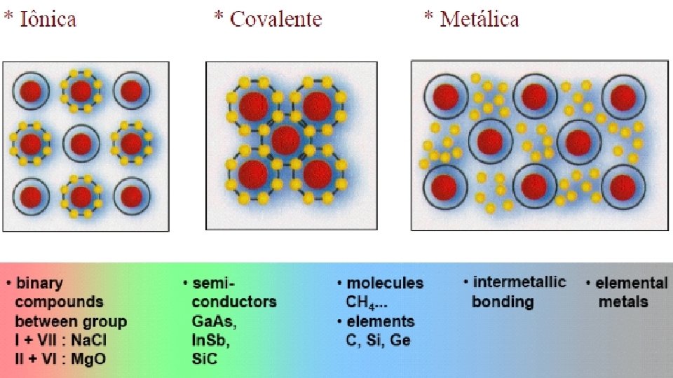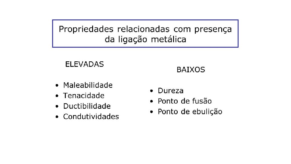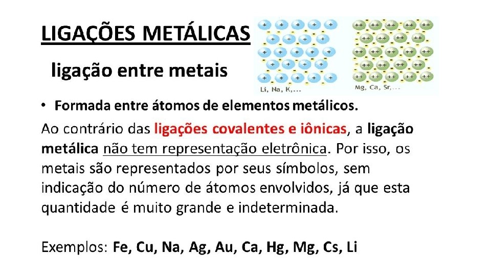 Ligações metálicas • Uma ligação metálica se forma quando átomos cedem seus elétrons de valência, que então formam um mar de elétrons. O núcleo dos átomos, positivamente carregados se ligam, por atração mútua, aos elétrons carregados negativamente.
