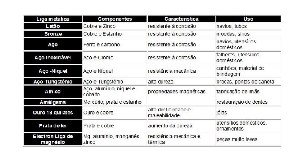 Aço-> liga de ferro e carbono, no caso do aço inoxidável, adicionam-se ainda crômio e níquel Bronze->liga de cobre e estanho; Ouro 18 quilates ->liga de ouro e cobre;