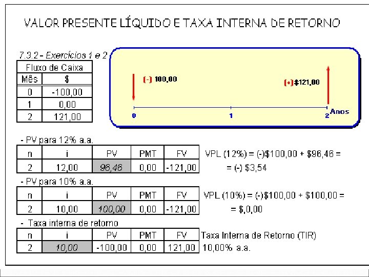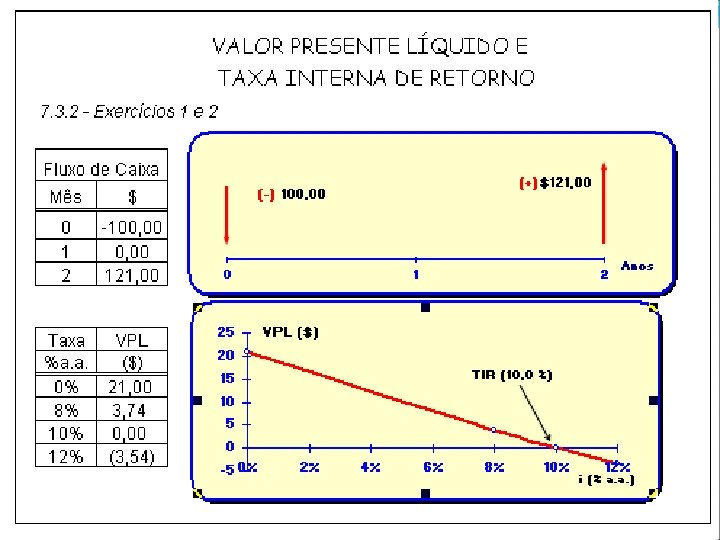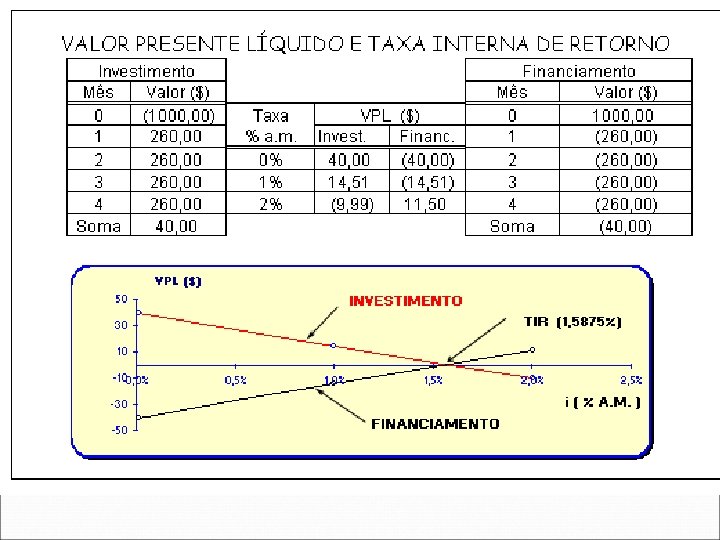 Taxa interna de retorno (TIR) É a taxa de desconto ( i ) que anula o valor presente líquido (NPV) do fluxo de caixa e corresponde a uma das raízes de um polinômio de grau n. FLUXO DE CAIXA VALOR PERÍODO CF 0 CF 1 CF 2 … CFn 0 1 2 … n VPL ( i ) = CF 0 + CF 1 / (1+ i ) + CF 2 / ( 1+ i )2 + … + CFn / ( 1 + i )n Para x = 1 / ( 1 + i ) obtém-se: VPL (TIR ) = CF 0 + CF 1. x + CF 2. x 2 + … + CFn. xn = 0