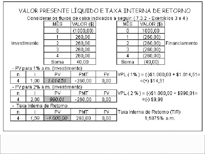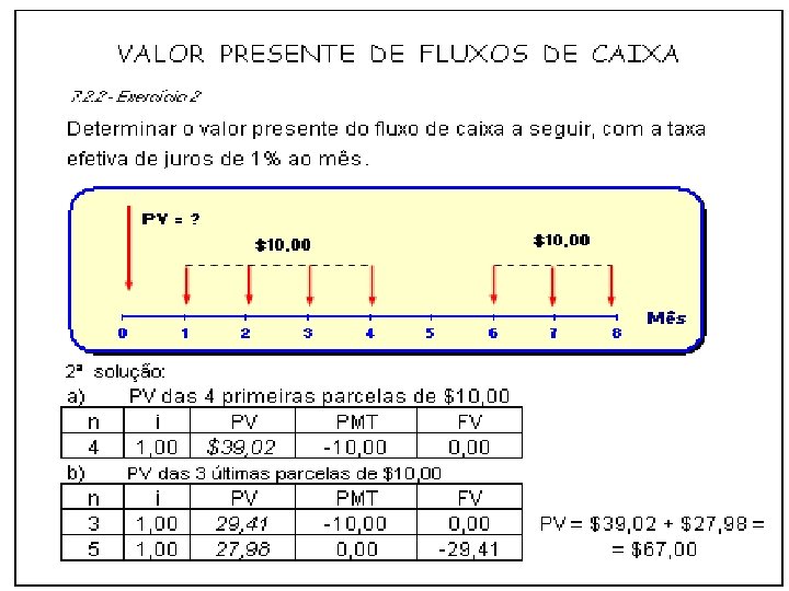 - PV das 3 prestações iguais: n i PV PMT FV 3 8, 00 2. 577, 10 -1. 000, 00 - PV da parcela do 4º ano: n i PV PMT FV 4 8, 00 2. 205, 09 0, 00 -3. 000, 00 PV = $2, 577, 10 + $2. 205, 09 =$4. 782, 19