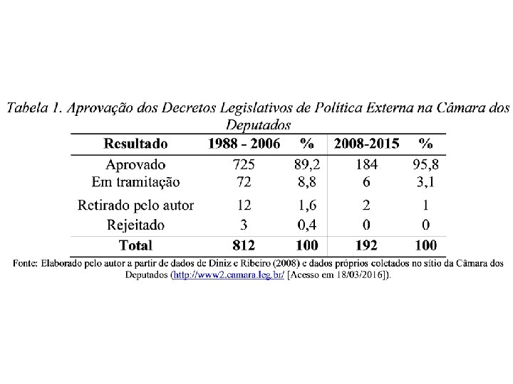 Agenda de Pesquisa Variáveis Independentes Variáveis Dependentes • Poderes Constitucionais • Apoio à Política Externa Presidencial (voto, tramitação, nomeações, entre outros) • Partidos Políticos (Ideologia, Disciplina, Governo Dividido, Coalizões) • Grau de Influência na Política Externa (preferências) • Tipo de Governo • Comportamento Legislativo • Sistema Eleitoral • Votações Nominais • Grupos de Interesse • Estabilidade da Política Externa • Condições socio-econômicas distritais • Nível de Barganha nas Negociações Internacionais – Jogos de Dois Níveis • Eleitorado/Opinião Pública • Temas • Sistema Internacional / Contexto Internacional