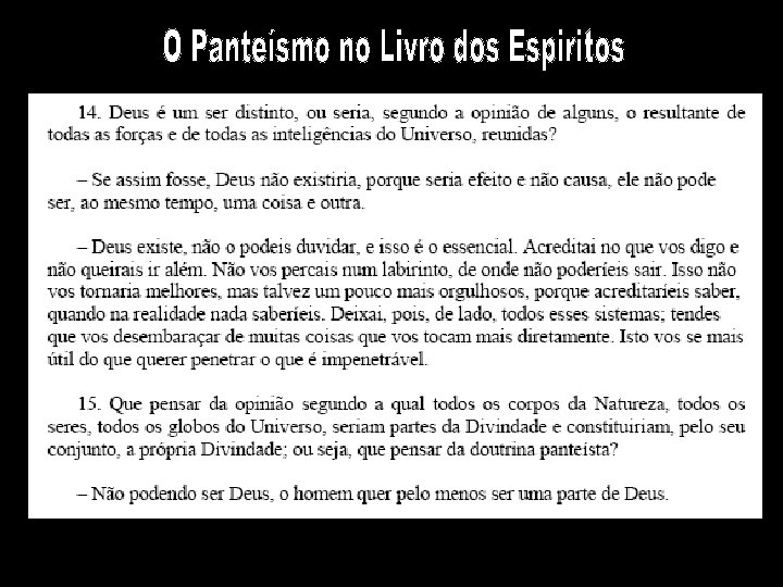 “O Espiritismo é ao mesmo tempo uma ciência de observação e uma doutrina filosófica. Como ciência prática, ele consiste nas relações que se podem estabelecer com os Espíritos; como filosofia, ele compreende todas as conseqüências morais que decorrem dessas relações”. ( O que é Espiritismo, pág. 12) “O Espiritismo sendo independente de toda forma de culto, não prescreve nenhum deles, e não se ocupa de dogmas particulares, não é uma religião especial, porque não tem nem seus sacerdotes e nem seus templos” ( O que é Espiritismo, pág. 190) “Eis porque sem ser, em si mesmo, uma religião, ele (o Espiritismo) leva essencialmente às idéias religiosas, as desenvolve naqueles que não as têm e as fortifica naqueles em que elas são hesitantes” (O que é Espiritismo, pág. 107 )