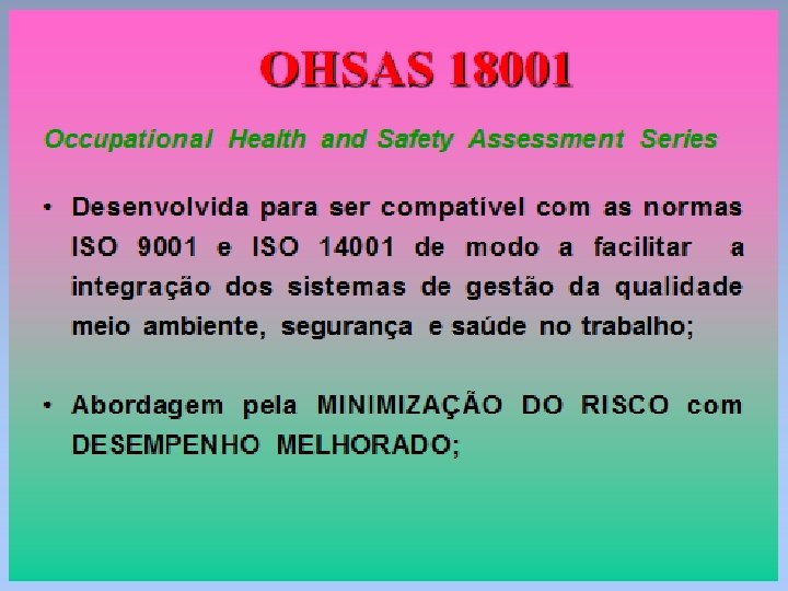 Esta Norma de SST não inclui requisitos específicos de outros sistemas de gestão, tais como: • • Aqueles da qualidade; Ambiental; Segurança patrimonial; Gestão financeira Muito embora seus elementos possam ser alinhados ou integrados aos de outros sistemas de gestão. É possível a uma organização adaptar seu sistema de gestão existente de maneira a estabelecer um sistema de gestão da SST que esteja em conformidade com os requisitos desta Norma OHSAS.