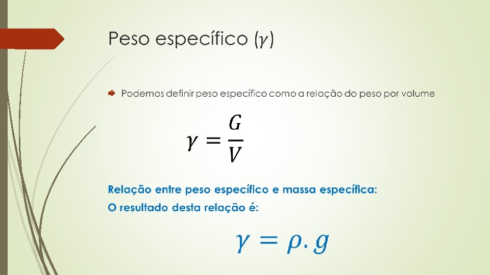 Massa específica (ρ) Também conhecida como densidade, é a relação entre a massa e o volume de um fluido. densidade da água à 25°C é de 1, 0 g. cm-1 É importante observar que a densidade é variável com a temperatura.
