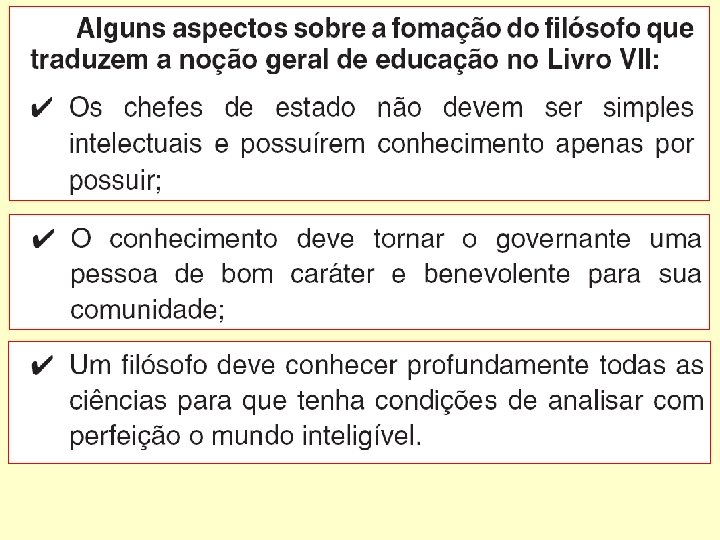 06. (UFPR 2006) Leia o seguinte trecho extraído do livro VII de A República, de Platão. “Eis o que devemos agora pensar sobre o assunto seguinte: a educação não é aquilo que alguns, que fazem disso profissão, afirmam que é. Se não me engano, pretendem que têm o poder de, quando o saber não está na alma, introduzi-lo nela como se se introduzisse a vista em olhos cegos [. . . ] Mas o que nosso discurso atual significa é que este poder está presente na alma de cada um, assim como o órgão por meio do qual cada um pode aprender. ”