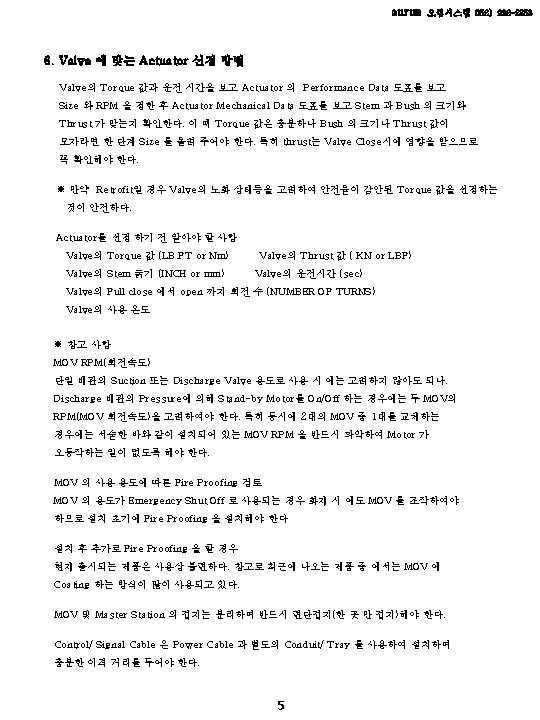aurum 오럼시스템 052) 222 -2358 3. Actuator 종류 Actuator 의 사용은 valve의 자동화를 목적으로 사용되는 일종의 부가 장치로써 제어 방법에 따라 크게 3가지로 구분된다 Actuator의 종류 구 분 설 명 Electric Actuator (전기) Motor 의 회전력과 Gear 의 조합을 이용하여 Valve의 동작 제어 Penumatic Actuator (공압) Cylinder 내의 Piston 또는 Diaphragm를 이용하여 가해지는 압력, 유량, 기체(Gas)의 물리적 에너지에 의한 valve 동작 제어 Hydraulic Actuator (유압) Cylinder 내의 Piston을 이용하여 Water, Oil에 가해지는 압력, 유량의 물리적 에너지 에 의한 Valve 의 동작 제어 운동 원리에 따른 구분 구 분 설 명 적 용 Valve Part turn or Quarter turn ¼ turn Actuator 0˚~90˚ 회전에 사용 가능 Ball, Butterfly, Plug, Damper Multi turn 1회~5000회 까지 회전 가능 Rising , Non-Rising type 에 사용 가능 Lift Valve 에 사용 ( Gate, Globe, Diaphragm, Sluice, Angle ) Rectilinear Motion (직선운동) Multi turn Actuator 에 Linear thrust Unit 를 부착하여 운동에너지 변환 (회전운동 → 직선운 동) Globe, Diaphragm, Damper 1
