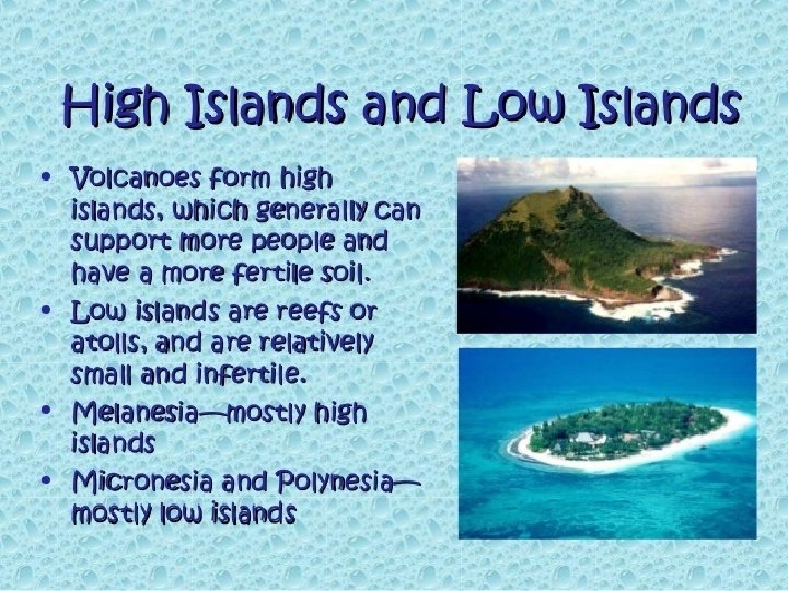 No one knows how many islands exist in the Pacific Ocean, but some geographers estimate that there are more than 20, 000. As a group, the Pacific Islands are called Oceania. Most Pacific islands fall into one of two categories: high islands created by volcanoes or low islands made of coral reef build up created by a submerged volcanoes. Most low islands are Atolls.