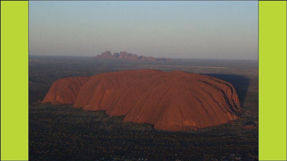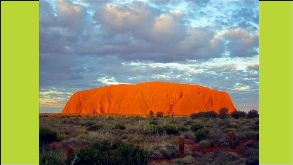 Ayers Rock • A huge, reddish rock in the center of Australia. • It’s located very close to the geographic center of the continent. • It’s a monolith, which is a single, large rock sticking out of the earth. • It appears reddish because its iron content “rusts” at the surface. • It’s nearly 12 stories high and almost 6 miles wide!