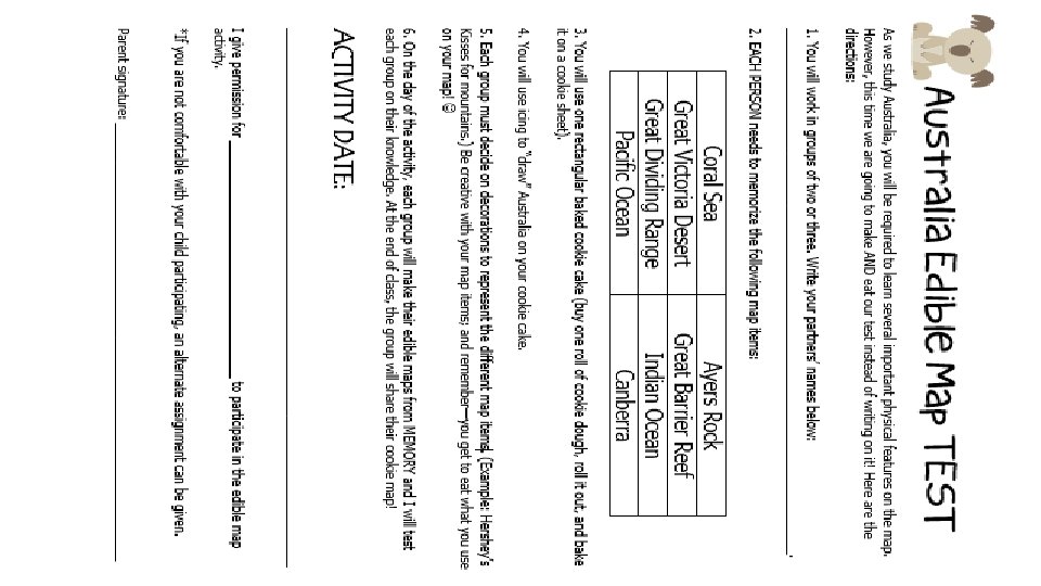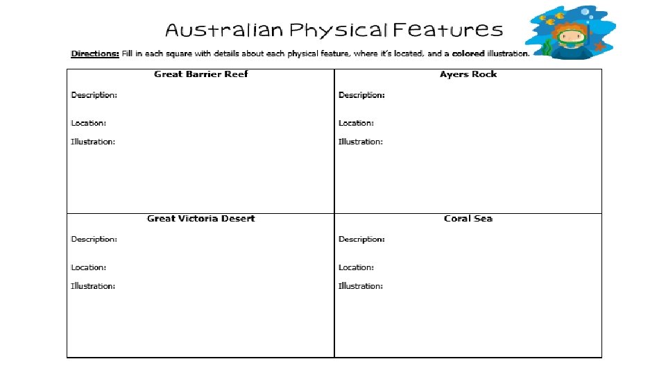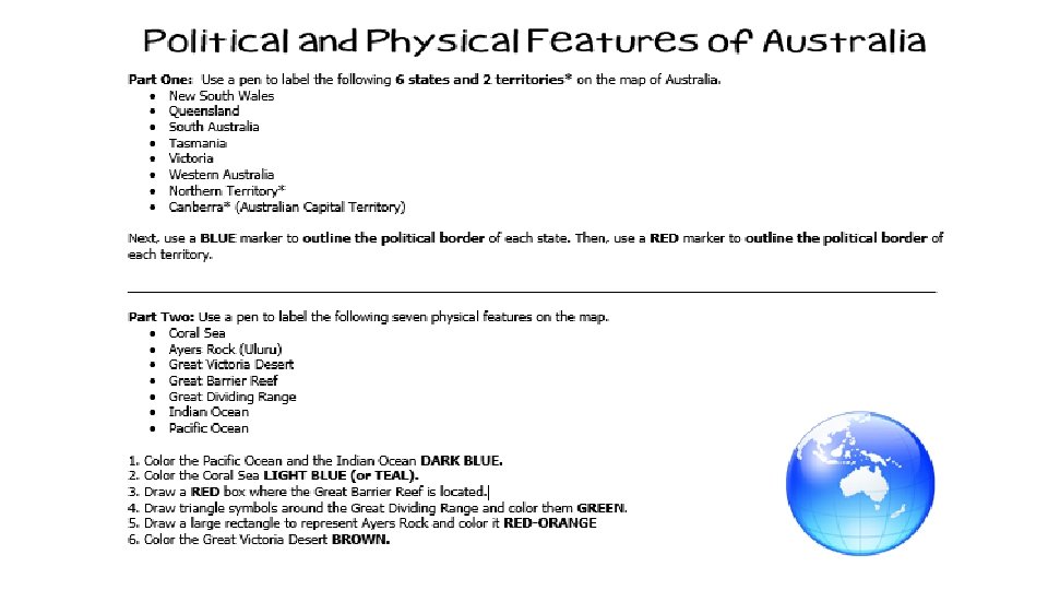 Standards SS 6 G 12 The student will be able to locate selected features of Australia. a. Locate on a world and regional politicalphysical map: the Great Barrier Reef, Coral Sea, Ayers Rock, and Great Victoria Desert.