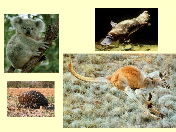 Živočíšstvo » Austrália má svoje typické živočíchy » Sú to najmä vačkovce : kengury, koaly » Vtákopysky, ježure, rôzne druhy vtákov a hadov » Jediným dravým zvieraťom je pes dingo » Európania doviezli ovce – merino, králiky, potkany. . » Kozy, osly, kone a vodné byvoly – tieto zvieratá žijú vo voľnej prírode
