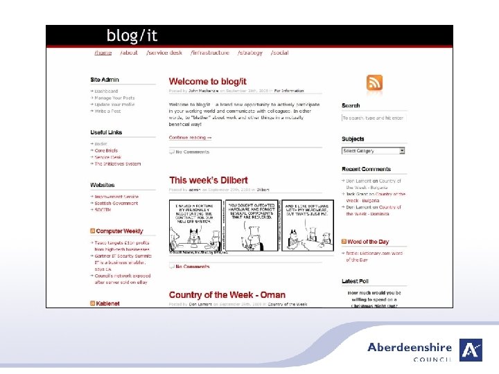 An Alternative Approach • Multi-author blog with commenting • Integrated internal and external links, RSS feeds, user polls etc. • Content from managers and other staff • Use freely available Open Source tool • Deliver solution quickly