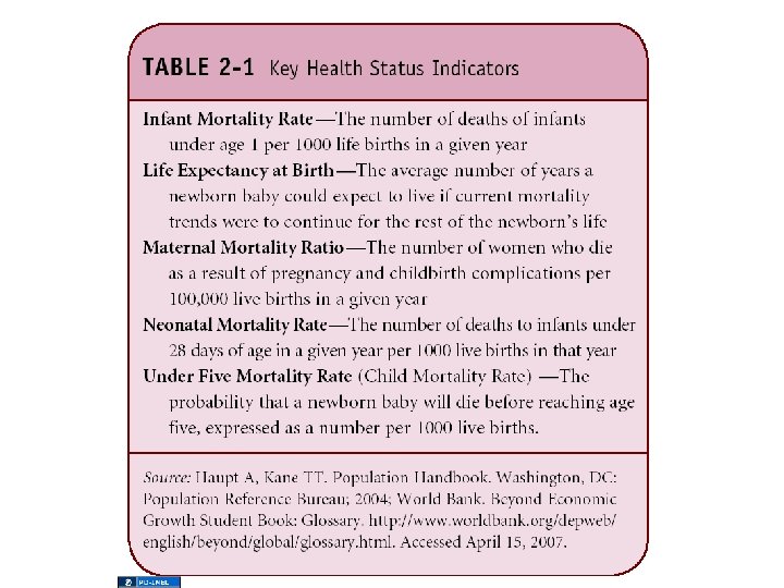 Additional Reasons to Study Global Health - Disparities INDICATORS LIBERIA UNITED STAES (2007) (2005 -2007) Population 3. 2 million 300 million Life Expectancy for Females at Birth 44 years 81 years 37 years 71 years Total Expenditure on Health per capita $22. $6697. Maternal Mortality Rate (per 100, 000 live births) 994 14 Under 5 Mortality Rate (per 1, 000 live births) 110 8 Infant Mortality Rate (per 1, 000 live births) 71 7 Fertility Rate per Woman 5. 2 <2. 0 Coverage of Vital Registration of Deaths <25% 100% Healthy Life Expectancy at Birth for Females Source: Undetermined