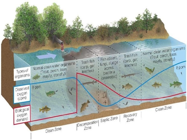 3. Zona de recuperação: após intenso consumo de matéria orgânica e degradação do ambiente, este tende a se recuperar gradativamente. 4. Zona de águas limpas: as características iniciais voltam a ser atingidas no que diz respeito ao oxigênio dissolvido, matéria orgânica e bactérias.