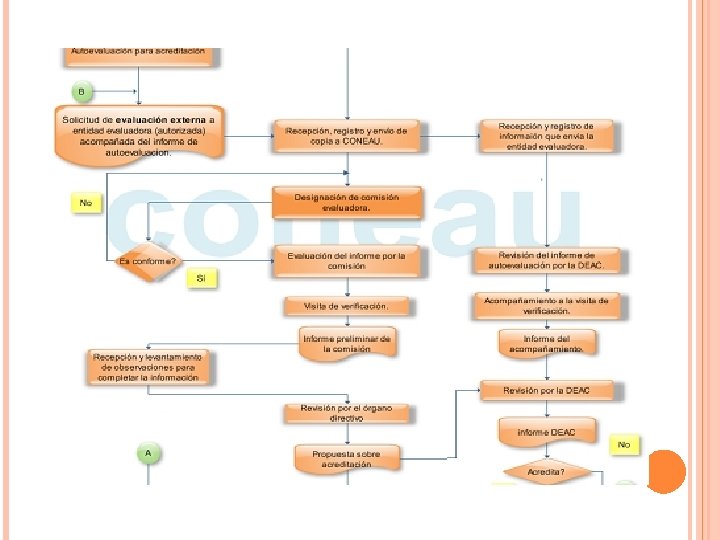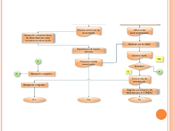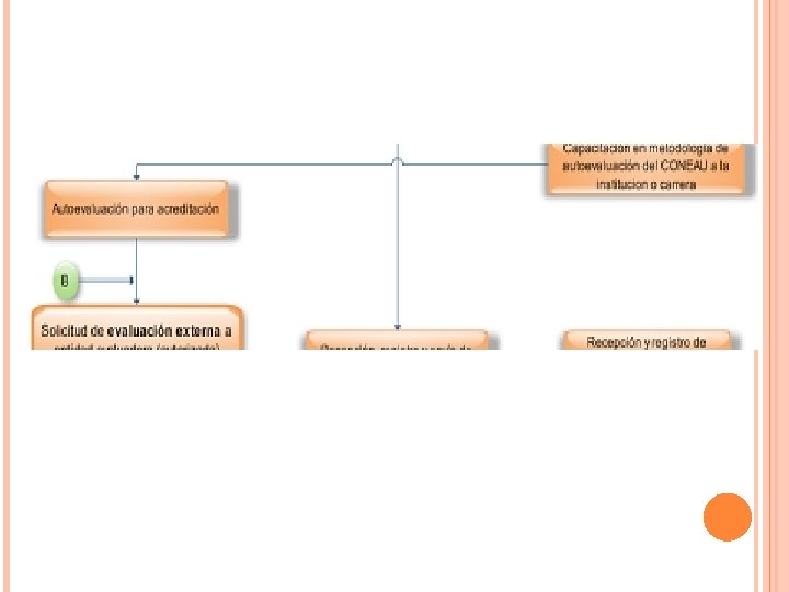 Génesis del proceso Verificación de información Decisión de acreditación Elaboración del informe de evaluación con propuesta de acreditación Visita de verificación Revisión del informe final de autoevaluación por comisión evaluadora y observador de la DEA Designación de comisión evaluadora Recepción, registro de solicitud Presentación de solicitud de evaluación externa Proceso de evaluación externa Resultado de acreditación