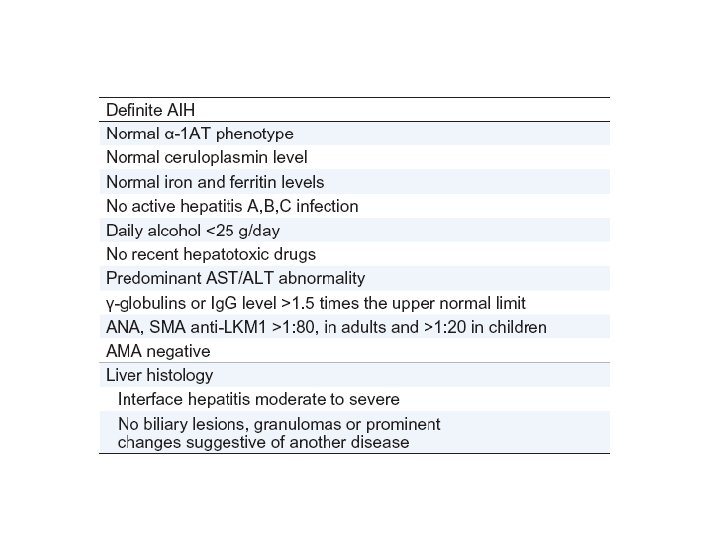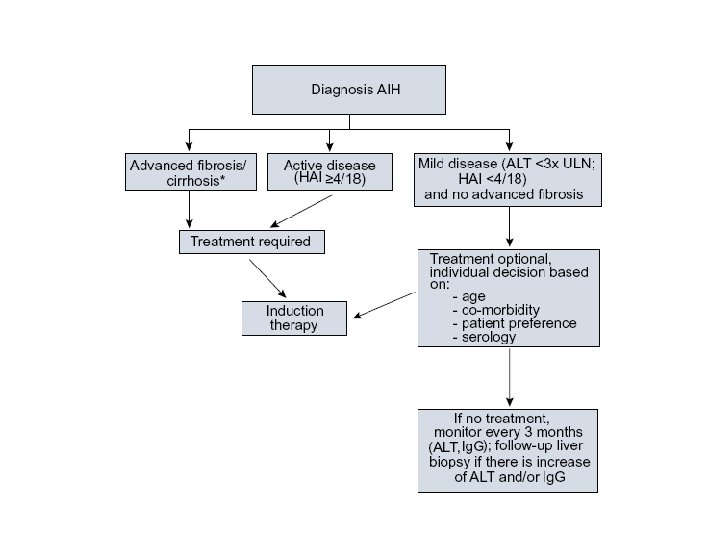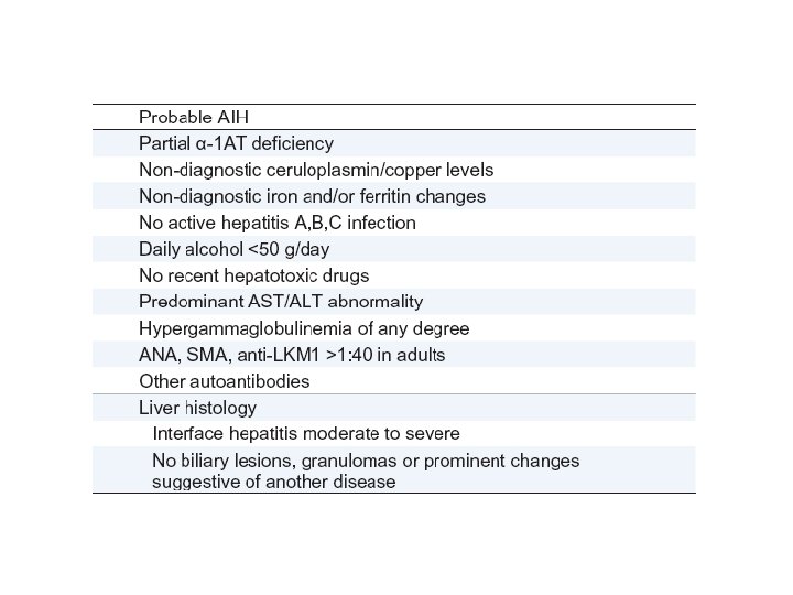 § Autoantibodies – ANA, ASMA, LKM-1, SLA § Ig. G – Typically elevated in autoimmune hepatitis § Histology – Interface hepatitis, lymphocytic or lymphoplasmacytic infiltrate, rosettes § Exclusion of viral hepatitis – Hepatotropic viruses and others Hennes et al. Hepatology 2008; 48: 169