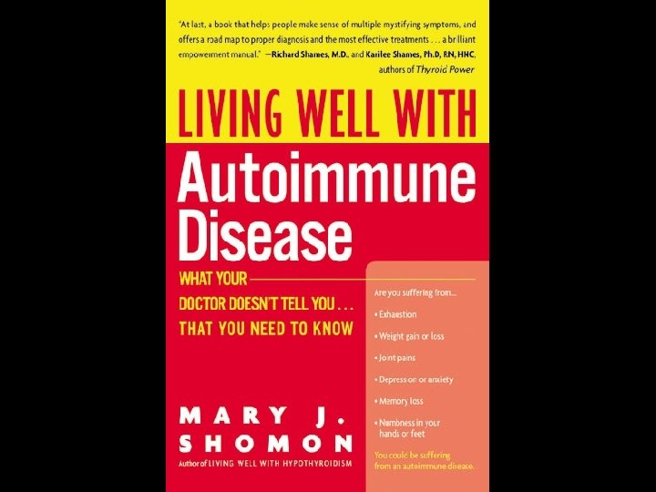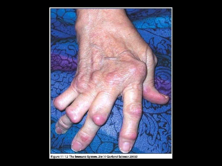 RHEUMATOID ARTHRITIS (RA) * Effector mechanism • CD 4 T cells, activated B cells, macrophages and plasma cells • 85% of patients have rheumatoid factor * Rheumatoid factor • Ig. M, Ig. G and Ig. A specific for Ig. G • Immune complex formation exacerbates inflammation * Laboratory diagnosis • Rheumatoid factor (RF) • Anti-cyclic citrullinated peptide (Anti-CCP) • C-reactive protein (CRP)