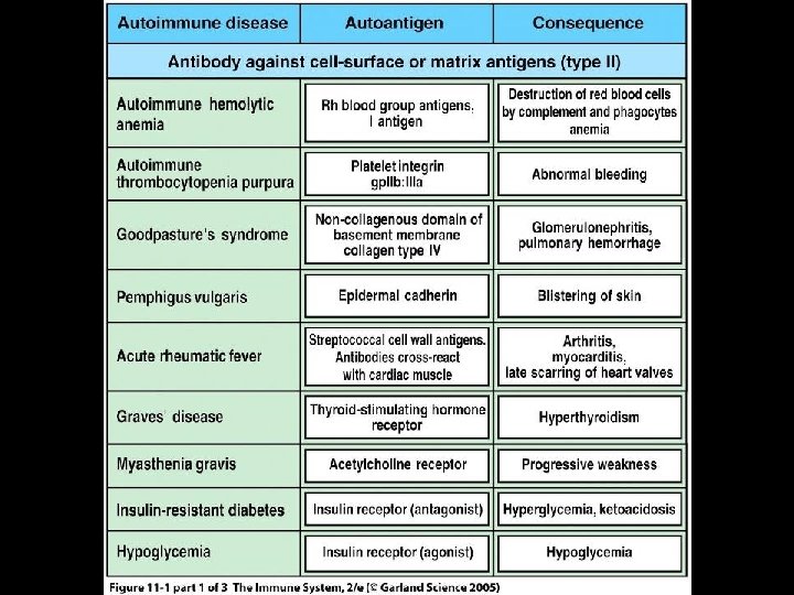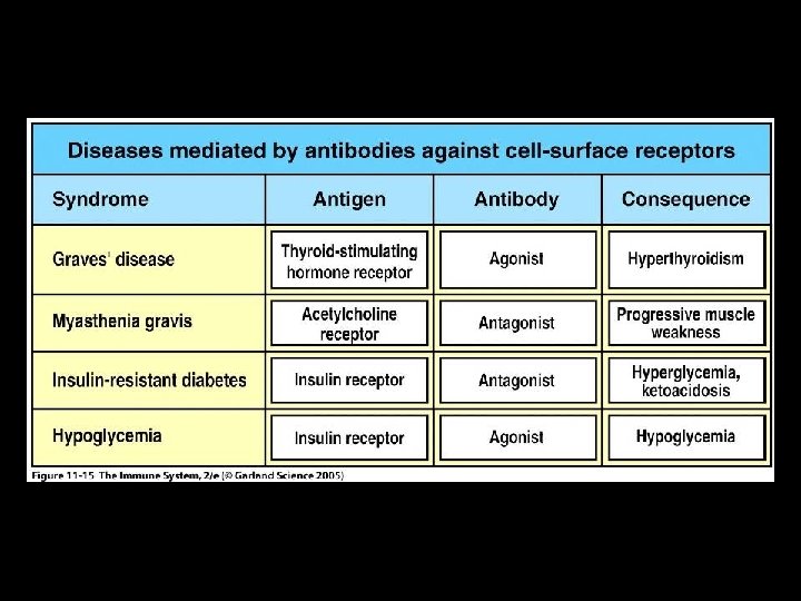 EFFECTOR MECHANISM OUTCOMES IN TYPE II AUTOIMMUNE DISEASE * Cell surface antigen autoantibodies • Cell and tissue destruction * Cell surface receptor autoantibodies • Agonistic • Stimulate receptor • Antagonistic • Inhibit receptor