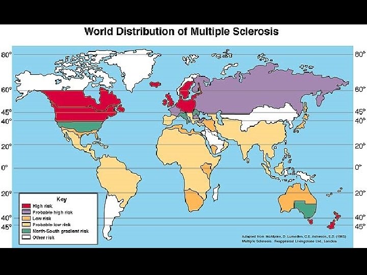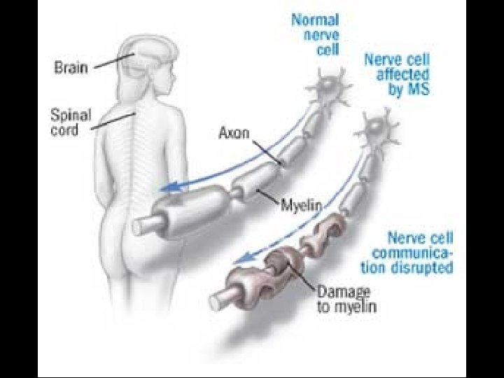 MULTIPLE SCLEROSIS (MS) * Chronic unpredictable disease of CNS with four possible clinical courses * Characterized by patches of demyelination and inflammation of myelin sheath * Prevalence higher in Northern Hemisphere • North of 37 th parallel (125 cases /100, 000) • South of 37 th parallel (70 cases /100, 000) * Female to male ratio of 2: 1