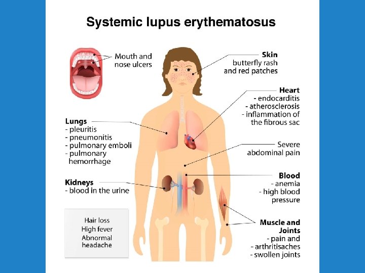 SYSTÉMOVÝ LUPUS ERYTHEMATODES § multiorgánové systémové onemocnění § postihuje převážně ženy v reprodukčním období § prevalence 1: 4000 § autoprotilátky reagují se složkami jaderného aparátu buněk, narušují buněčné funkce, imunokomplexy obsahující ds. DNA se ukládají v tkáních § laboratorní nálezy: vysoká FW, nízké CRP, cytopenie (trombocytopenie, leukopenie, hemolytická anémie), snížení C 4, C 3, hypergamaglobulinémie