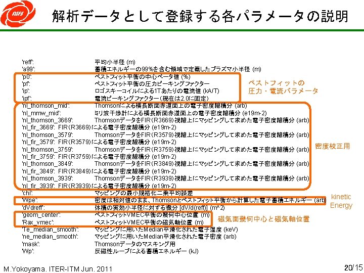 高ベータ放電に対するマッピング実行 例 0. 1%刻みで スキャン p 0の粗い スキャン p 0の細かい スキャン Best Fit 初期値を 1回更新 実験値 使用 固定 #104000 f 201/290: 4. 000 s Rax= 3. 600 m Bq= 100% gamma=1. 197 avac= 0. 556 m denl=2560. 607 [a. u. ] nel_fir= 2. 776 nel_mmw= 1. 162 [10^19 m^-2] kk= 0 p 0= 0. 00 pf= 2. 21 ip= 30. 2 ipf= 2. 00 sts= 0 err= 0 a 99= 0. 561 avmec= 0. 555 chi= 281. 537 kk= 0 k= 1 p 0= 1. 00 pf= 2. 21 ip= 30. 2 ipf= 2. 00 sts= 0 err= 0 a 99= 0. 563 avmec= 0. 555 chi= 227. 343 kk= 0 k= 2 p 0= 2. 00 pf= 2. 21 ip= 30. 2 ipf= 2. 00 sts= 0 err= 0 a 99= 0. 562 avmec= 0. 554 chi= 160. 080 kk= 0 k= 3 p 0= 3. 00 pf= 2. 21 ip= 30. 2 ipf= 2. 00 sts= 0 err= 0 a 99= 0. 563 avmec= 0. 554 chi= 96. 478 kk= 0 k= 4 p 0= 4. 00 pf= 2. 21 ip= 30. 2 ipf= 2. 00 sts= 0 err= 0 a 99= 0. 562 avmec= 0. 553 chi= 41. 250 kk= 0 k= 5 p 0= 5. 00 pf= 2. 21 ip= 30. 2 ipf= 2. 00 sts= 0 err= 0 a 99= 0. 558 avmec= 0. 552 chi= 8. 351 kk= 0 k= 6 p 0= 6. 00 pf= 2. 21 ip= 30. 2 ipf= 2. 00 sts= 0 err= 0 a 99= 0. 554 avmec= 0. 552 chi= 10. 649 kk= 1 k= 0 p 0= 4. 40 pf= 2. 37 ip= 30. 2 ipf= 2. 00 sts= 0 err= 0 a 99= 0. 561 avmec= 0. 552 chi= 25. 381 kk= 1 p 0= 4. 50 pf= 2. 37 ip= 30. 2 ipf= 2. 00 sts= 0 err= 0 a 99= 0. 560 avmec= 0. 552 chi= 22. 146 kk= 1 k= 2 p 0= 4. 60 pf= 2. 37 ip= 30. 2 ipf= 2. 00 sts= 0 err= 0 a 99= 0. 560 avmec= 0. 552 chi= 18. 782 kk= 1 k= 3 p 0= 4. 70 pf= 2. 37 ip= 30. 2 ipf= 2. 00 sts= 0 err= 0 a 99= 0. 559 avmec= 0. 552 chi= 15. 990 kk= 1 k= 4 p 0= 4. 80 pf= 2. 37 ip= 30. 2 ipf= 2. 00 sts= 0 err= 0 a 99= 0. 559 avmec= 0. 552 chi= 13. 004 kk= 1 k= 5 p 0= 4. 90 pf= 2. 37 ip= 30. 2 ipf= 2. 00 sts= 0 err= 0 a 99= 0. 559 avmec= 0. 552 chi= 10. 761 kk= 1 k= 6 p 0= 5. 00 pf= 2. 37 ip= 30. 2 ipf= 2. 00 sts= 0 err= 0 a 99= 0. 558 avmec= 0. 552 chi= 8. 840 kk= 1 k= 7 p 0= 5. 10 pf= 2. 37 ip= 30. 2 ipf= 2. 00 sts= 0 err= 0 a 99= 0. 558 avmec= 0. 552 chi= 7. 251 kk= 1 k= 8 p 0= 5. 20 pf= 2. 37 ip= 30. 2 ipf= 2. 00 sts= 0 err= 0 a 99= 0. 557 avmec= 0. 552 chi= 5. 961 kk= 1 k= 9 p 0= 5. 30 pf= 2. 37 ip= 30. 2 ipf= 2. 00 sts= 0 err= 0 a 99= 0. 557 avmec= 0. 552 chi= 4. 627 kk= 1 k=10 p 0= 5. 40 pf= 2. 37 ip= 30. 2 ipf= 2. 00 sts= 0 err= 0 a 99= 0. 557 avmec= 0. 552 chi= 3. 863 kk= 1 k=11 p 0= 5. 50 pf= 2. 37 ip= 30. 2 ipf= 2. 00 sts= 0 err= 0 a 99= 0. 556 avmec= 0. 552 chi= 3. 157 kk= 1 k=12 p 0= 5. 60 pf= 2. 37 ip= 30. 2 ipf= 2. 00 sts= 0 err= 0 a 99= 0. 556 avmec= 0. 552 chi= 3. 261 kbest=11 p 0= 5. 50 pf= 2. 52 ip= 30. 2 ipf= 2. 00 sts= 0 err= 0 a 99= 0. 556 avmec= 0. 551 chi= 3. 372 Wpe= 21400. 0 geom_ 3. 732 Rax_v 3. 847 nl_thomson= 2203. 09 nl_thomson_R 3579= 868. 67 nl_thomson_R 3669= 865. 74 nl_thomson_R 3759= 866. 31 nl_thomson_R 3849= 787. 54 nl_thomson_R 3939= 899. 77 M. Yokoyama. ITER-ITM Jun. 2011 28/15