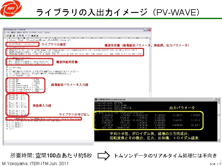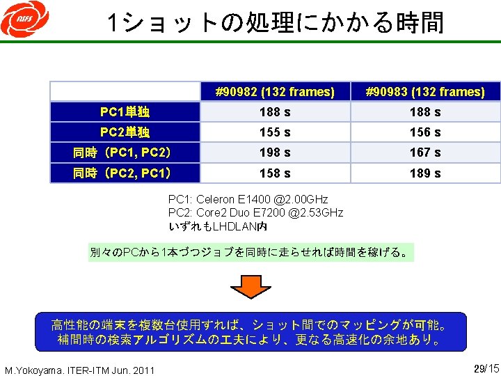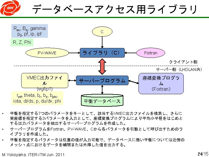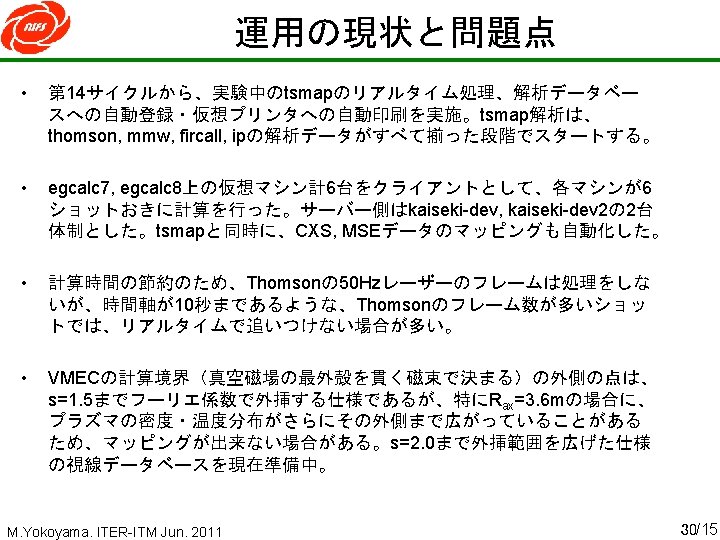 “line of sight” database 3 D-equilibrium database “line-of-sight” database • • Not necessary to execute conversion program every time just call “line of sight” database prepared by equilibrium database Faster plasma reconstruction has become possible ex. , 155 s for 132 frame (time-slices) Core 2 Duo E 7200 @2. 53 GHz M. Yokoyama. ITER-ITM Jun. 2011 13/15