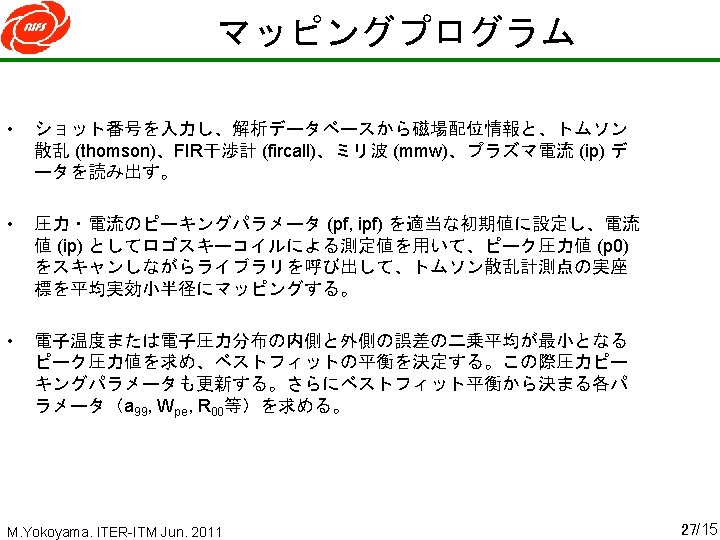 マッピング実行例 Initial p 0=0. 00, pf=2. 14, ip=30. 2, ipf=2. 00, a 99=0. 561, avmec=0. 555, chi=281. 537 M. Yokoyama. ITER-ITM Jun. 2011 Best Fit p 0=5. 50, pf=2. 52, ip=30. 2, ipf=2. 00, a 99=0. 556, avmec=0. 551, chi=3. 372 26/15