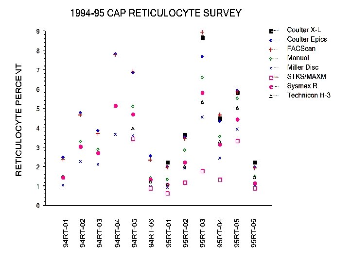 Reticulocyte Proficiency Testing College of American Pathologists 1994 -96 Program - surrogate blood material Methodologies Approved for Testing New Methylene Blue visual microscopy Sysmex R series (auramine O) Flow Cytometry - Thiazole Orange Flow Cytometry - Other dyes Coulter STKS/MAXM - NMB Miles Technicon H 3 - Oxazine