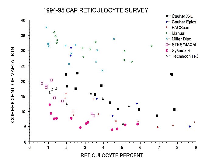 Intermethod Correlation Studies • Single site studies: multiple published – improved precision - CVs <15% – intermethod bias, but “clinically insignificant” • Davis et al: AJCP 102: 468, 1994 – 8 sites, 11 instruments, 310 blood samples – IRF and Retic counts compared • College of American Pathologists’ Reticulocyte RT Survey 1994 -96 – >2, 600 participants – surrogate blood material – Retic % only reported