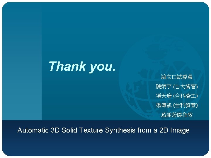 Automatic 3 D Solid Texture Synthesis from 論文口試委員 a 2 D Image 陳炳宇 (台大資管) 項天瑞 (台科資 ) 楊傳凱 (台科資管) 歡迎蒞臨指教 Jia-Wei Chiou 邱家瑋 Computer Graphics & Multimedia Lab. , NTUST