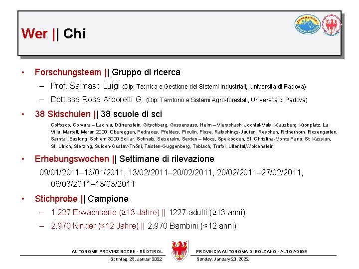 Wer || Chi • Forschungsteam || Gruppo di ricerca – Prof. Salmaso Luigi (Dip. Tecnica e Gestione dei Sistemi Industriali, Università di Padova) – Dott. ssa Rosa Arboretti G. (Dip. Territorio e Sistemi Agro-forestali, Università di Padova) • 38 Skischulen || 38 scuole di sci Colfosco, Corvara – Ladinia, Dürrenstein, Gitschberg, Gossensass, Helm – Vierschach, Jochtal-Vals, Klausberg, Kronplatz, La Villa, Martell, Meran 2000, Obereggen, Pedraces, Pfelders, Piculin, Plose, Ratschings-Jaufen, Reschen, Rittnerhorn, Rosengarten, Sarntal, Saslong, Schlern 3000 Sciliar, Schnals, Seiseralm, Sexten – Moos, Speikboden, St. Christina-Monte Pana, St. Kassian, St. Ulrich, Sterzing, Sulden-Gustav-Thöni, Taisten-Guggenberg, Toblach, Trafoi, Ultental, Wolkenstein • Erhebungswochen || Settimane di rilevazione 09/01/2011– 16/01/2011, 13/02/2011– 20/02/2011, 20/02/2011– 27/02/2011, 06/03/2011– 13/03/2011 • Stichprobe || Campione – 1. 227 Erwachsene (≥ 13 Jahre) || 1227 adulti (≥ 13 anni) – 2. 970 Kinder (≤ 12 Jahre) || 2. 970 Bambini (≤ 12 anni) AUTONOME PROVINZ BOZEN - SÜDTIROL Sonntag, 23. Januar 2022 PROVINCIA AUTONOMA DI BOLZANO - ALTO ADIGE Sunday, January 23, 2022