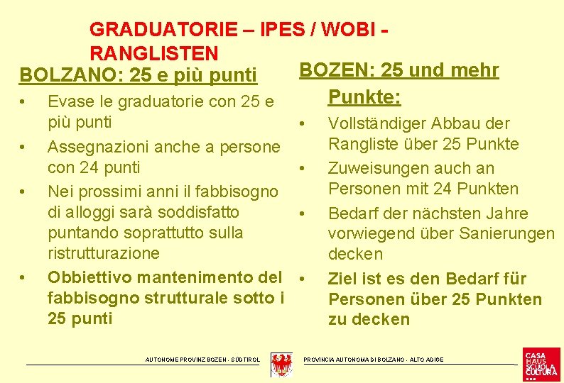 GRADUATORIE – IPES / WOBI Übersicht > 25 P in Bozen Panoramica > 25 punti a RANGLISTEN Bolzano Panoramica > 25 P provincia e comuni Übersicht > 25 P Provinz + Gemeinden AUTONOME PROVINZ BOZEN - SÜDTIROL PROVINCIA AUTONOMA DI BOLZANO - ALTO ADIGE