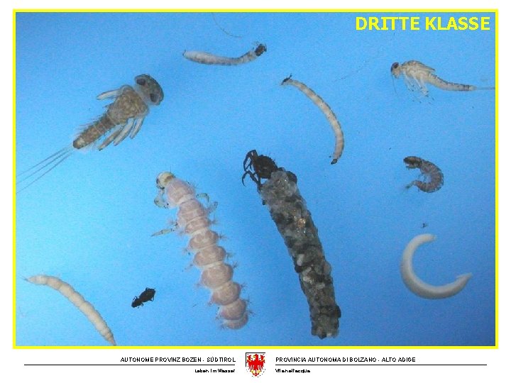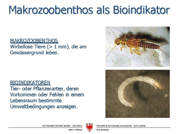 Warum Makrozoobenthos ? § legt nur kurze Strecken zurück § mit freiem Auge sichtbar § reagiert empfindlich bei Belastungen § Biologische Analysen ermitteln die Gewässergüte über einen langen Zeitraum. Die Lebewesen reagieren auf chemische und morphologische Veränderungen über längere Zeit. § Chemische Analysen ermitteln bestimmte Verunreinigungsfaktoren zum Zeitpunkt der Probenahme. AUTONOME PROVINZ BOZEN - SÜDTIROL Leben im Wasser PROVINCIA AUTONOMA DI BOLZANO - ALTO ADIGE Vita nell’acqua