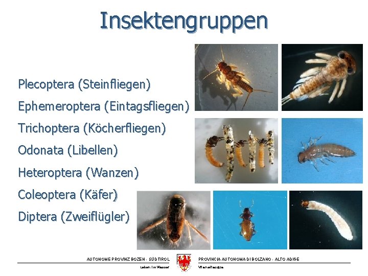 Insektengruppen Plecoptera (Steinfliegen) Ephemeroptera (Eintagsfliegen) Trichoptera (Köcherfliegen) Odonata (Libellen) Heteroptera (Wanzen) Coleoptera (Käfer) Diptera (Zweiflügler) AUTONOME PROVINZ BOZEN - SÜDTIROL Leben im Wasser PROVINCIA AUTONOMA DI BOLZANO - ALTO ADIGE Vita nell’acqua