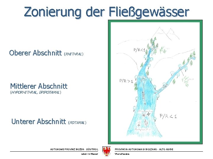 Zonierung der Fließgewässer Oberer Abschnitt (RHITHRAL) Mittlerer Abschnitt (HYPORHITHRAL, EPIPOTAMAL ) Unterer Abschnitt (POTAMAL) AUTONOME PROVINZ BOZEN - SÜDTIROL Leben im Wasser PROVINCIA AUTONOMA DI BOLZANO - ALTO ADIGE Vita nell’acqua