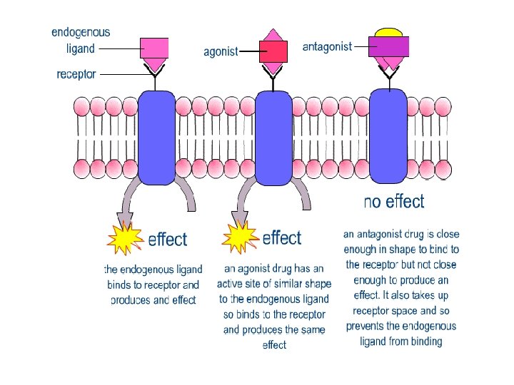 Antagonists • substance that blocks receptors so prevents the natural neurotransmitter or hormone from exerting its effect • example: propanolol a β 1 blocker, used to treat HTN decreases heart rate & force of contraction lowers BP – side effects: hypoglycemia, mild bronchoconstriction, decreases frequency & severity of migraines