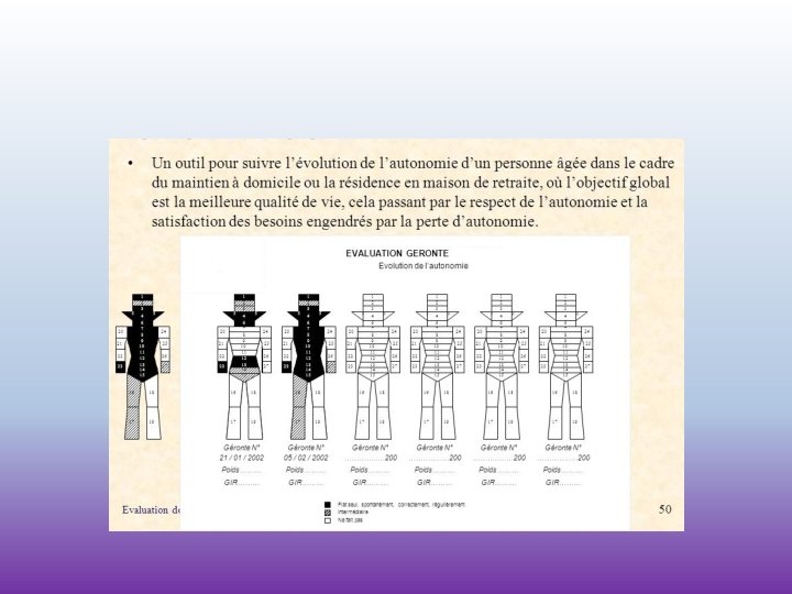 Ce qu’on évalue: • Dépendance physique: marche, déplacement, toilette, repos, élimination, alimentation • Dépendance psychique: comportement, raisonnement, mémoire, perception de la réalité, gestion de son budget • Dépendance sociale et relationnelle: communication, loisirs