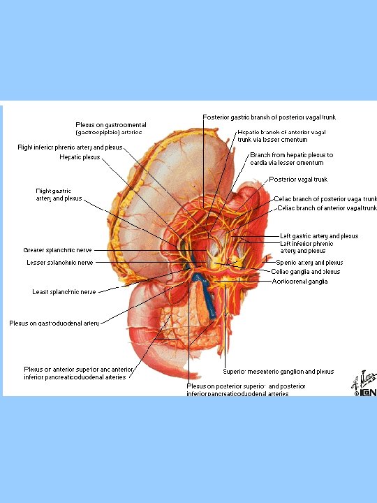 Prevertebrální ganglia ggl. coeliacum ggl. mesentericum superius ggl. mesentericum inferius ggl. aorticorenale Plexus aorticus lumbalis ggl. /plexus coeliacus plexus gastricus dx. , sn. plexus hepaticus plexus lienalis plexus duodenalis plexus pancreaticus plexus uretericus plexus testicularis/ovaricus ggl. mesentericum superius plexus mesentericus superior ggl. mesentericum inferius plexus mesentericus inferior plexus rectalis superior Plexus hypogastricus superior et inferior
