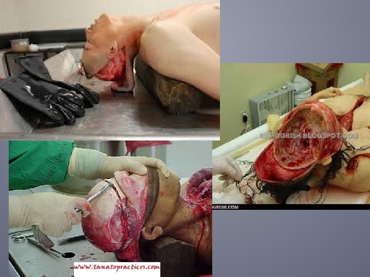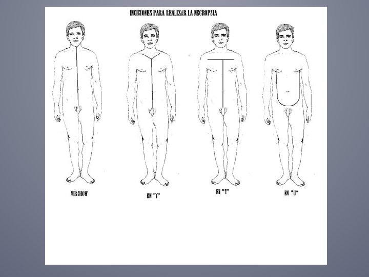 Incisión Examen interno Examen in situ Del tronco Remoción de las víceras Examen de cada una Incisión y repliegue de la piel cabelluda Abertura del cráneo De la cabeza Remoción de encéfalo Despegamiento de la duramadre